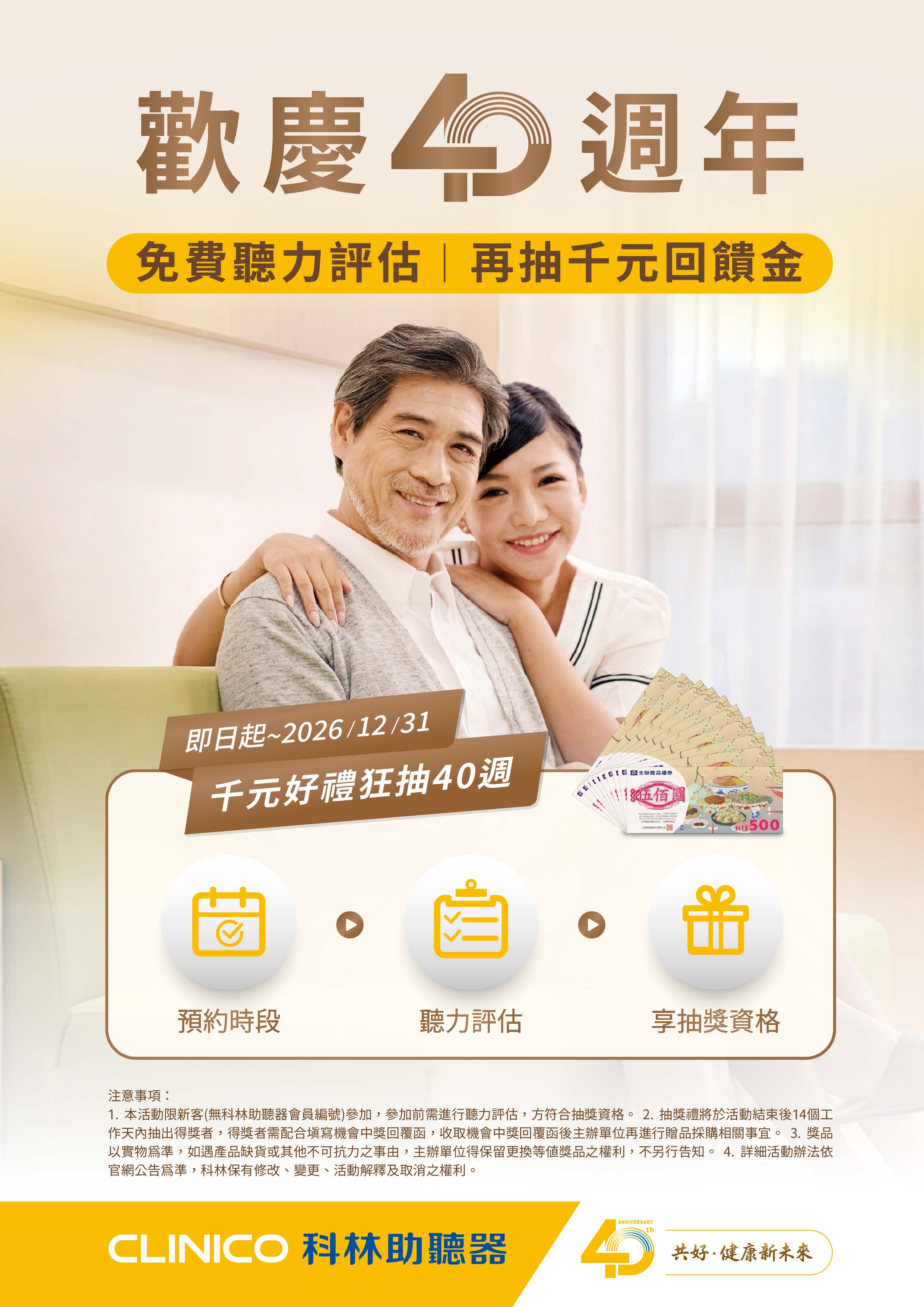 1. 本活動限 新客參加(未曾擁有科林助聽器會員編號者),須完成聽力評估後,方具抽獎資格。