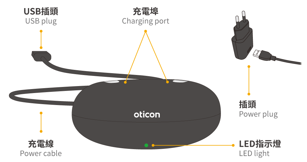 - 充電座未通電等同於助聽器離開充電座,將使您的助聽器呈開啟的狀態,而且持續耗電。因此,只要助聽器放在充電座上,就必須將充電座連接到電源。