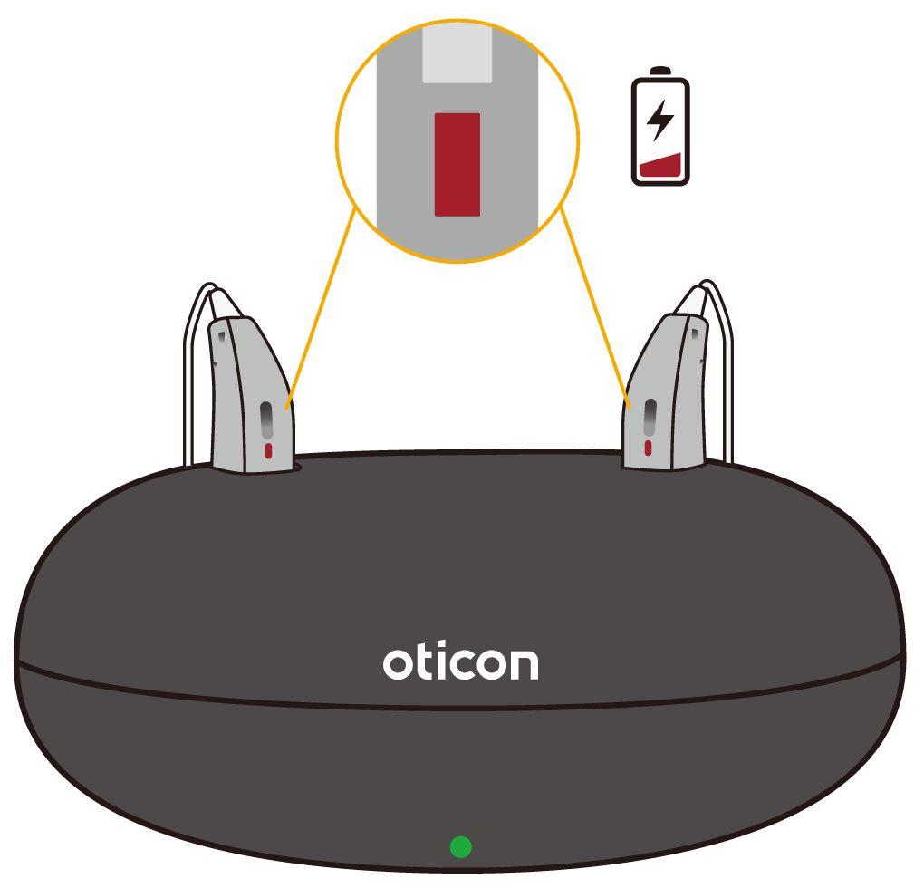 - 當助聽器正在充電時,助聽器上的LED將變為穩定的紅色。充滿電時,燈號轉為穩定的綠燈。
