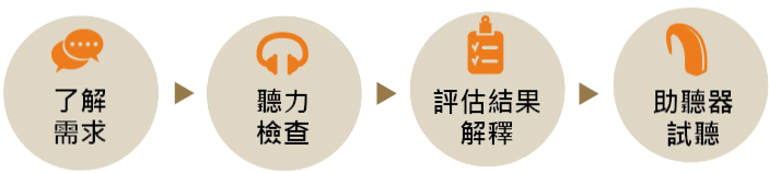 - 聽力師會先確認您的聽力變化史、了解影響您聽力的因素 、提供與您的聽力需求相關的資訊。接下來是聽力檢查, 在此步驟可能會輔以助聽器讓您體驗。接著,聽力師會清 楚地解釋聽力評估的結果,若您有聽力損失,此時才會依 照您的聽力狀況推薦適合的助聽器。