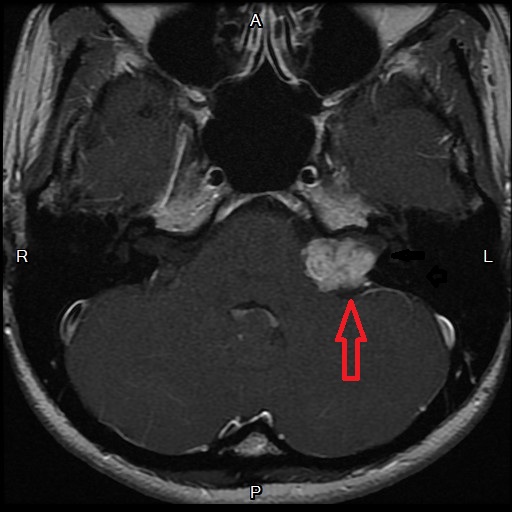 ►討論: 正常的聽覺反射路徑聲音由外耳→中耳→聽神經→足夠的音量則引起面神經之一分枝所控制之鐙骨肌收縮,此謂聽覺反射或鐙骨肌反射。聽覺反射發生在腦幹底部,由於正常人的反射是兩側性的,即單耳接受刺激音可引發兩側的反射反應,臨床上即利用此特性來考慮腦幹病變之可能。若病灶位於腦幹時,常造成對側聽覺反射無反應,但同側聽覺反射則正常。這是由於腦幹病灶阻斷了對側聽覺反射路徑,而同側之鐙骨反射弓仍健全之故。 約8成聽覺反射閥值異常之病患會出現耳蝸後病變,故可運用在臨床之耳鳴病患,篩檢出潛在的聽神經瘤病患、並依聽覺反射閾值報告推測並解釋核磁共振之病灶位置大小。 圖二:左耳聽神經瘤(紅箭頭)。