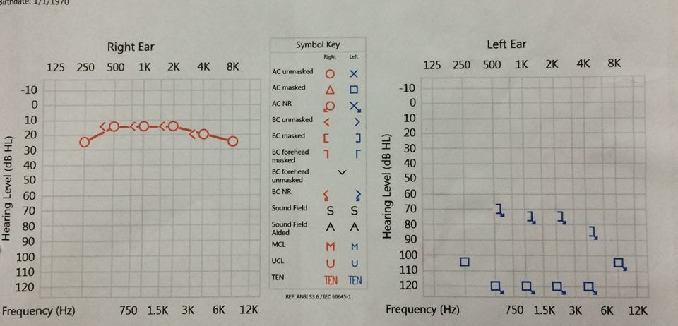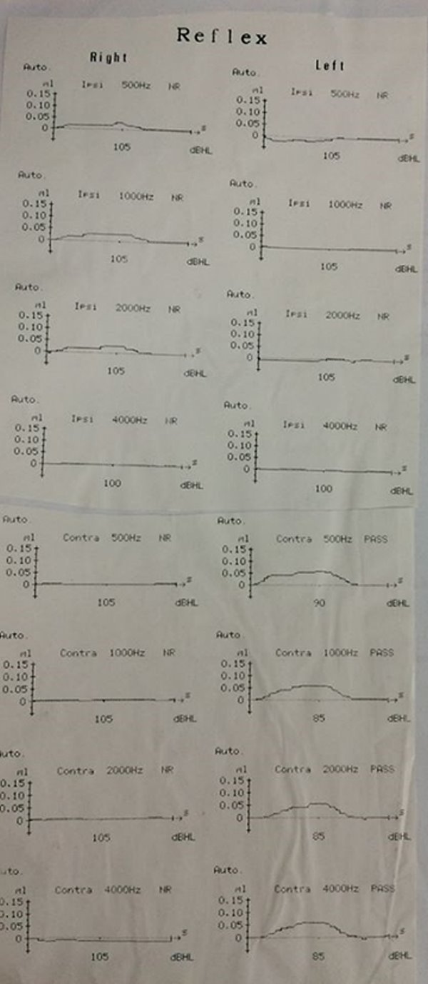 ►病例報告: 中年女性主訴左耳突發性聽障至本部就診,因左耳聽力完全喪失(圖一)則無聽性腦幹檢查之必要(一定無反應),直接排程核磁共振檢查可見左耳聽神經瘤(圖二)。聽覺反射閾值測驗(圖三)可見:Right Ipsi意謂同側耳右耳給音,右耳聽覺反射正常,可見波峰起伏);Right Contral意謂對側耳左耳給音,右耳聽覺反射消失,不見波峰起伏);Left Ipsi意謂同側耳左耳給音,左耳聽覺反射消失,不見波峰起伏);Left Contra意謂對側耳右耳給音,左耳聽覺反射正常,處可見波峰起伏)。 圖一:聽力圖。右耳正常,左耳聽力完全喪失。