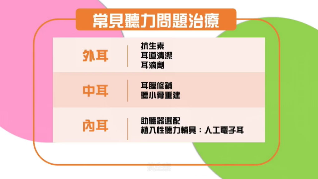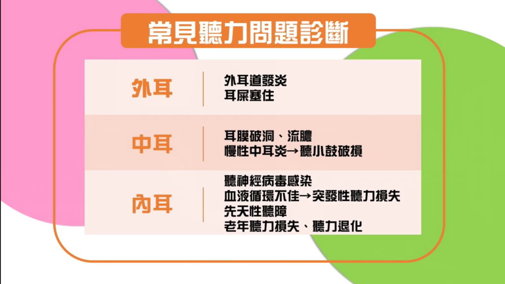所以在接受這些治療之後,醫生會給一些診斷,譬如說在外耳道,發炎或是耳屎塞住,都會造成一些聽力的問題。 那在耳朵的部分,中耳會造成一些耳膜的破洞、流膿,或是慢性中耳炎造成的聽小骨破損,都會造成我們聽力的相關問題。 在來內耳的部分,聽神經就是一個常常會遭受到病毒感染或是一些血液循的問題產生的突發性聽力損失。 另外,先天性聽障或室說在老人家一些聽力損失、聽力退化都會造成一些聽力狀況。