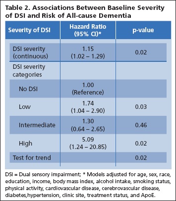 使用Cox回歸模型,我們通過計算危險比(HR)和95%置信區間(CI)來估計與感官障礙數量(0、1或2)相關的失智風險。無感官障礙的組用作參考組。調整了模型的基線協變量,包括人口統計學和心血管疾病以及失智症的危險因素。針對全因失智,僅AD和VaD(有或沒有AD)開發了單獨的模型。我們還通過構建損傷的匯總評分作為DSI嚴重性的最佳近似值,探索了DSI嚴重性與全因失智風險之間是否存在劑量反應關係。 (表一)