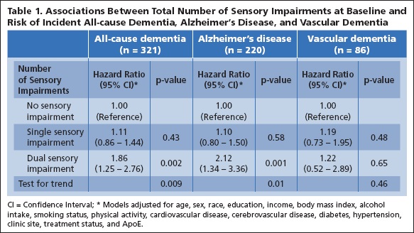 失智症和DSI雙重感官障礙 為了進行這項前瞻性隊列研究,分析了來自銀杏記憶評估(GEM)研究的2051名年齡在75歲及以上參與者,這些參與者在研究基線時無失智。簡而言之,GEM研究最初設計為一項雙盲隨機對照試驗,旨在確定銀杏葉在預防老年人失智症中的功效。19名參與者被要求在GEM研究的基線訪視時自我報告任何聽力或視力問題。那些報告說有聽力和視力問題的人被認為患有DSI。 利用GEM研究調查研究問題的主要優勢之一是對失智症的嚴格確定。每六個月對參與者進行失智事件評估,評估方法如前所述。包括考慮到審判委員會對失智症進行分類時的聽覺和視覺問題的影響,該委員會在每個失智症病例中都有審查員的敘述。根據《精神障礙診斷和統計手冊》第四版的標準,所有被判定為正在發展為失智症的參與者。特定失智亞型的指定是基於以下國家/地區的診斷標準:美國國家神經病學和傳染性疾病及中風學會-阿茲海默症和相關疾病協會,美國國家神經病學和中風學會,國際研究和神經科學學會和AD診斷和治療中心。