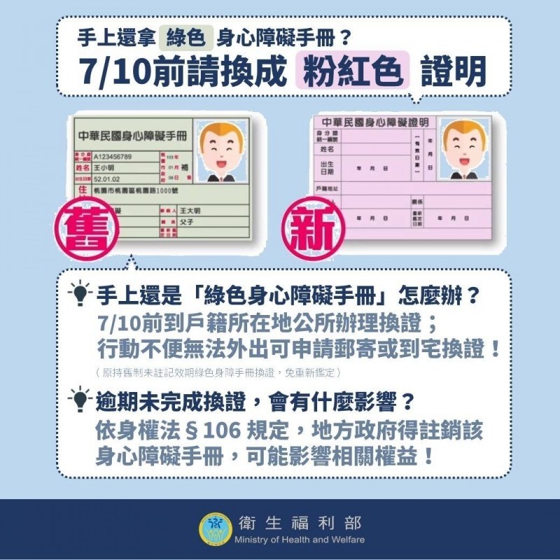 - 衛福部表示,原執舊制未註記效期之身心障礙手冊換發證明作業從104年7月11日至108年7月10日間採分批換發,目前已進入最後階段,民眾如果還使用綠色身心障礙手冊,務必在108年7月10日之前,到戶籍所在地的鄉(鎮、市、區)公所換成粉紅色證明,如逾期未完成換證,依身心障礙者權益保障法第106條規定,地方政府得註銷該身心障礙手冊,可能影響持有人相關權益。