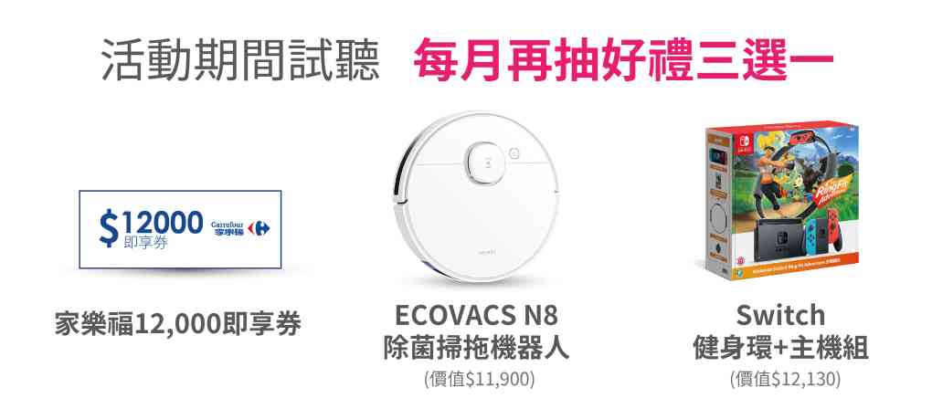 3. 【月月再抽】活動期間試聽,每月再抽好禮三選一:家樂福12,000即享券/Switch健身環+主機組(價值$12,130)/ECOVACS N8除菌掃拖機器人 (價值$11,900)