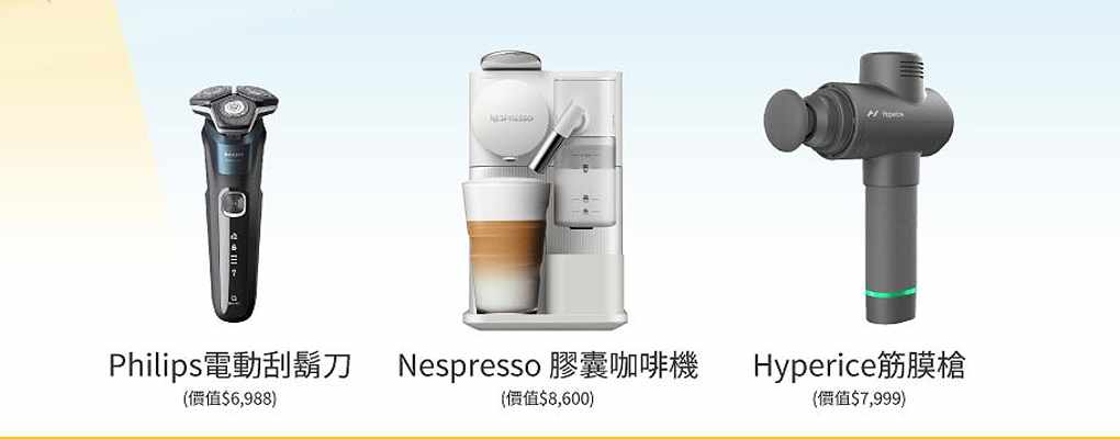 3) 抽家電 試聽加碼抽爸氣家電3選1: Philips電動刮鬍刀(價值$6,988) / Nespresso 膠囊咖啡機(價值$8,600) / Hyperice筋膜槍(價值$7,999)