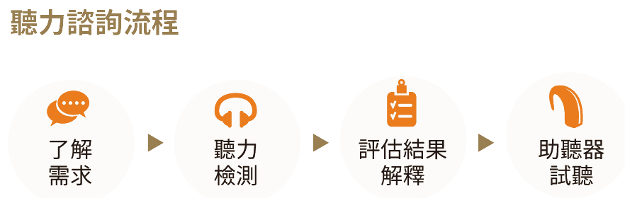 聽力師會先確認您的聽力變化史、了解影響您聽力的因素、提供與您的聽力需求相關的資訊。接下來是聽力檢測,在此步驟可能會輔以助聽器讓您體驗。接著,聽力師會清楚地解釋聽力評估的結果,若您有聽力損失,此時才會依照您的聽力狀況推薦適合的助聽器。