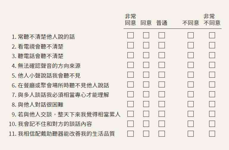 為使聽力諮詢過程更順利,請試著回想,您的聽力變化和它對您的影響,也可與親近的家人共同完成以下問卷,並於諮詢時交給聽力師,謝謝!