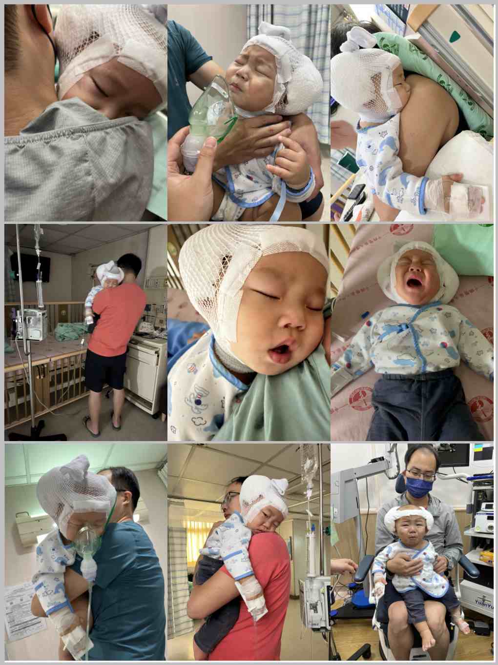 (2022)11月2日那天,帶著緊張忐忑的心到醫院辦了入院手續後,迎接的是一連串的檢查、治療、麻醉評估跟術前說明會,當回神鬆口氣時,已經是夜晚,以為用尿布防護你的活潑好動,就可以好好睡覺休息,殊不知,是整夜盯著你不時揮舞的超人手(靜脈注射部位)到天亮。